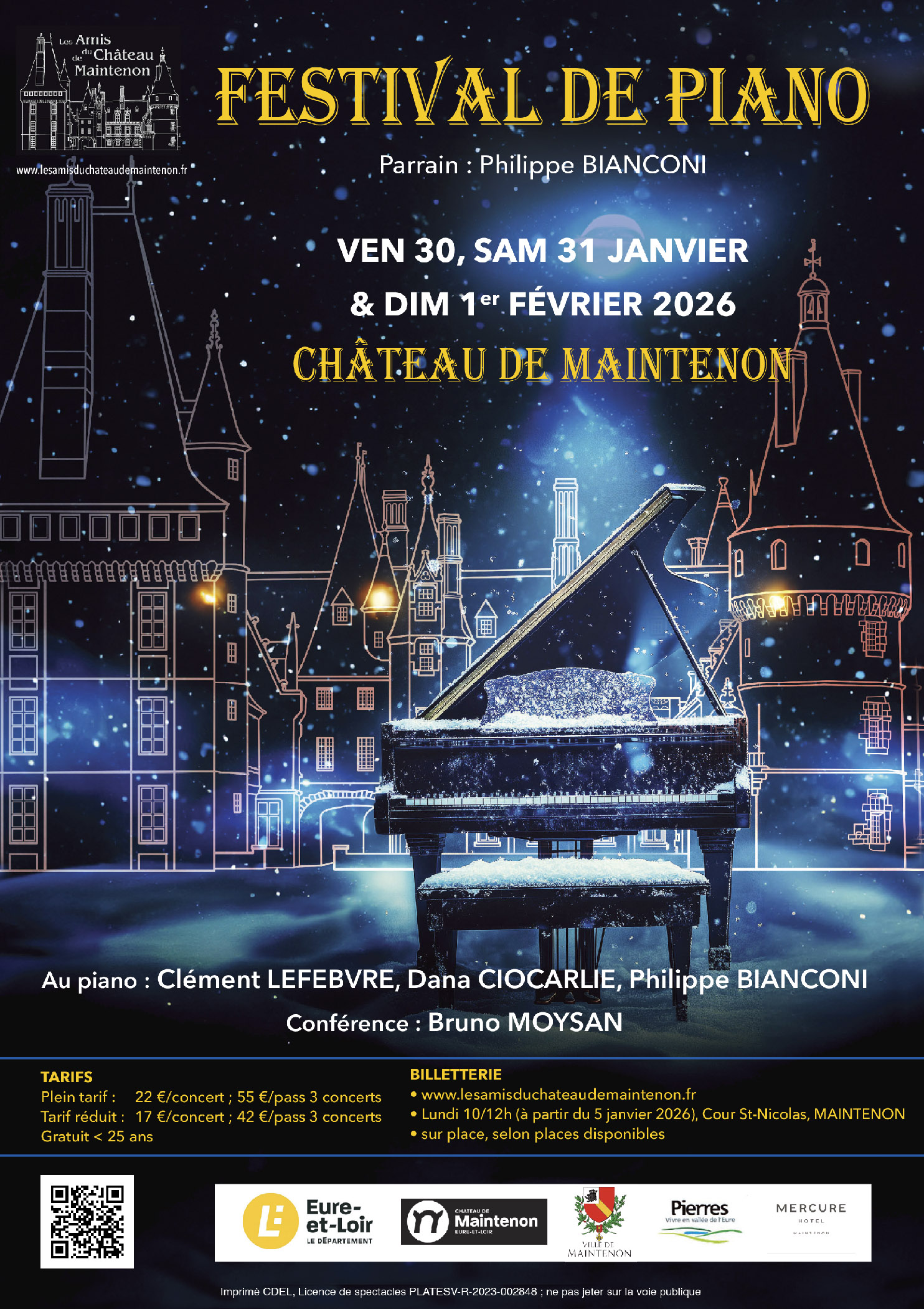 Les Amis du Château de Maintenon organisent leur 1er Festival de piano les vendredi 30, samedi 31 janvier et dimanche 1 er février 2026.