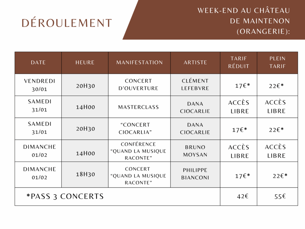 – Dimanche 01/02 : entre la Conférence et le Concert : Accueil dans les fauteuils du hall pour un goûter dont les viennoiseries vous seront offertes. Vous pourrez y accéder directement par le parc du château.